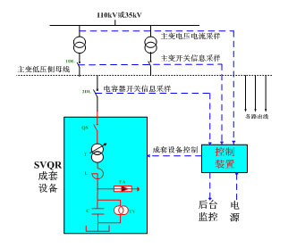 SVQR pressure adjustable reactive power substation reactive power automatic compensation device mainly comprises a first part and the two part is composed of two parts. A system diagram of the device is as follows: